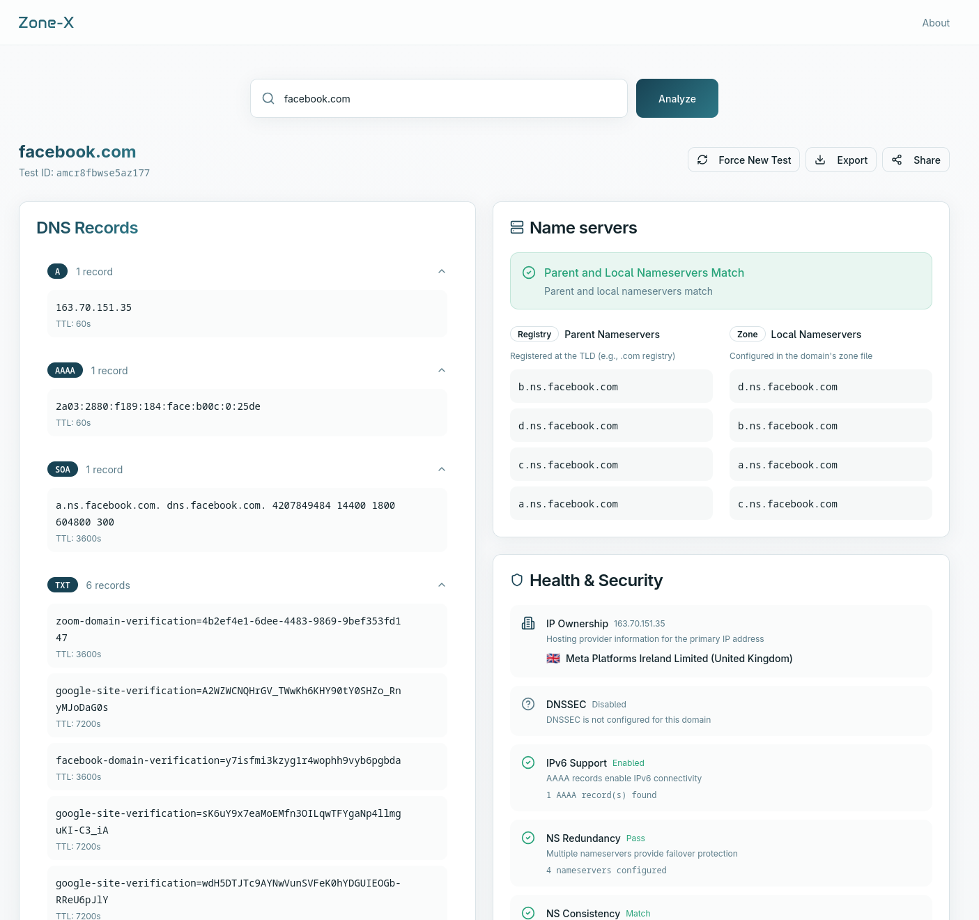 ZoneX هو أداة إحترافية لفحص وتشخيص نظام DNS، تتيح لك رؤية كاملة وواضحة لإعدادات النطاق الخاص بك. سواء كنت تحل مشكلة أثناء نقل خادم، تتحقق من إعدادات DNSSEC، أو تريد التأكد من أن تغييرات DNS انتشرت عالميًا، فإن ZoneX يوفر لك كل ما تحتاجه.