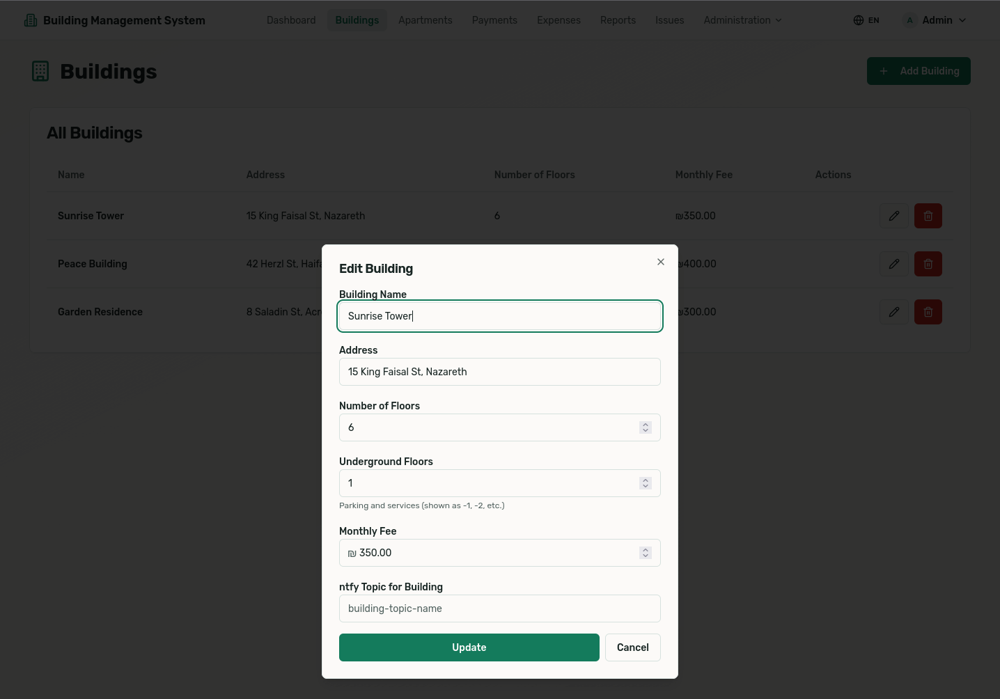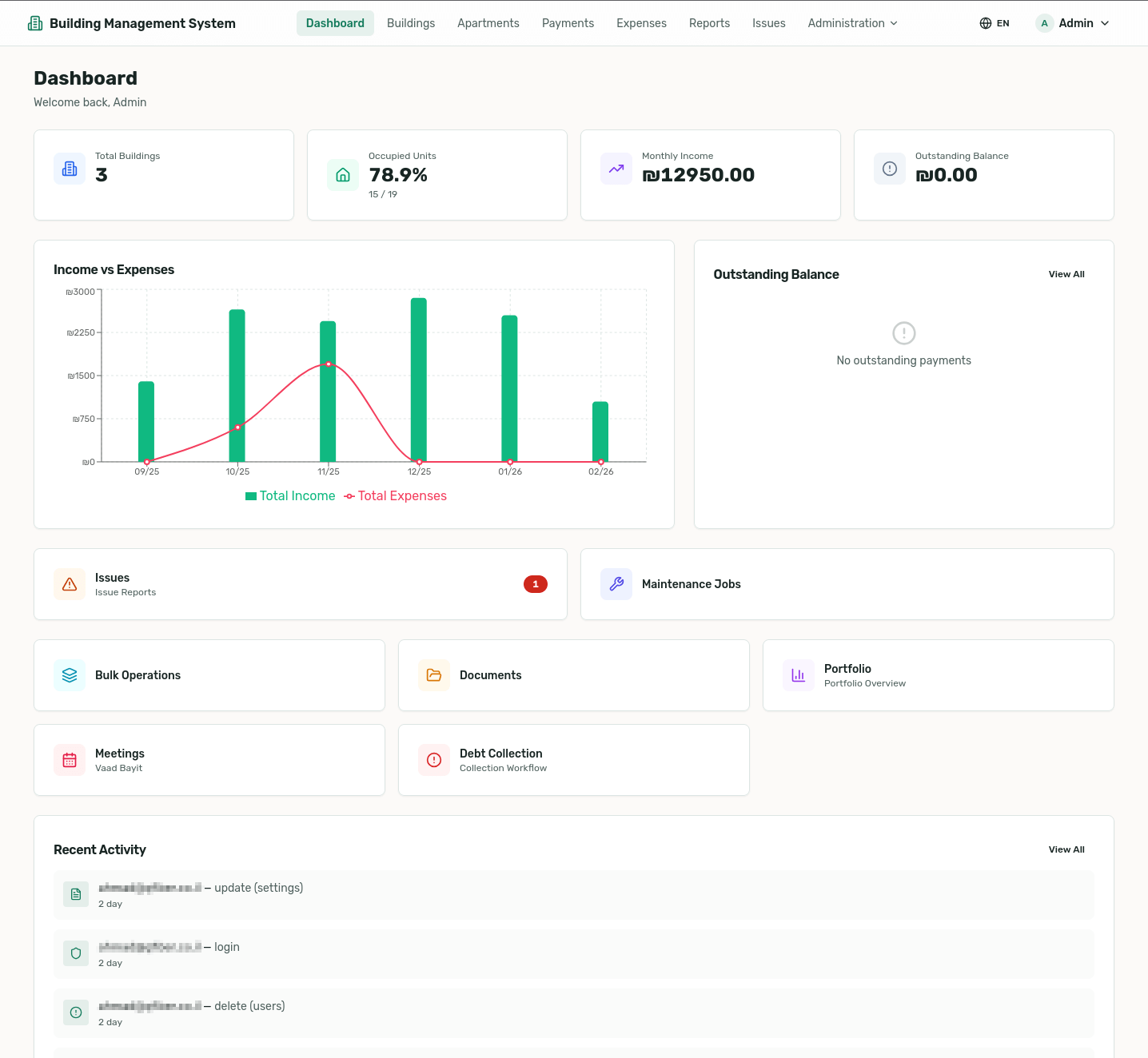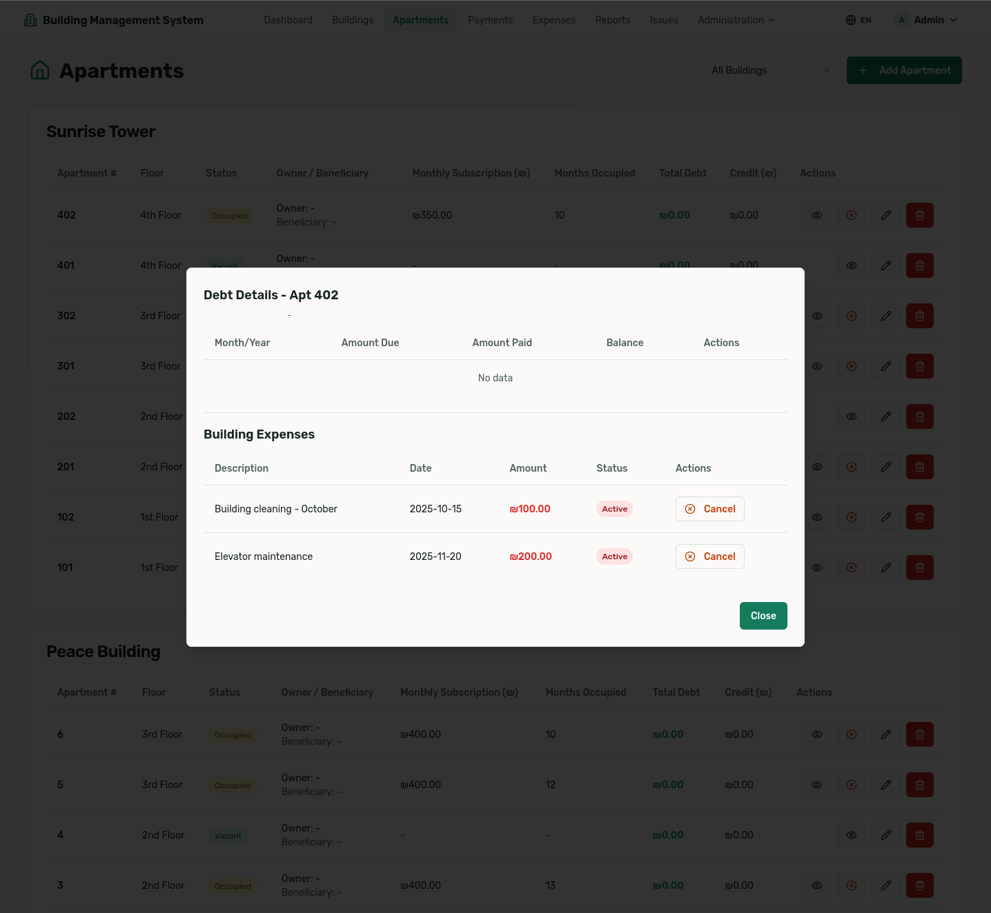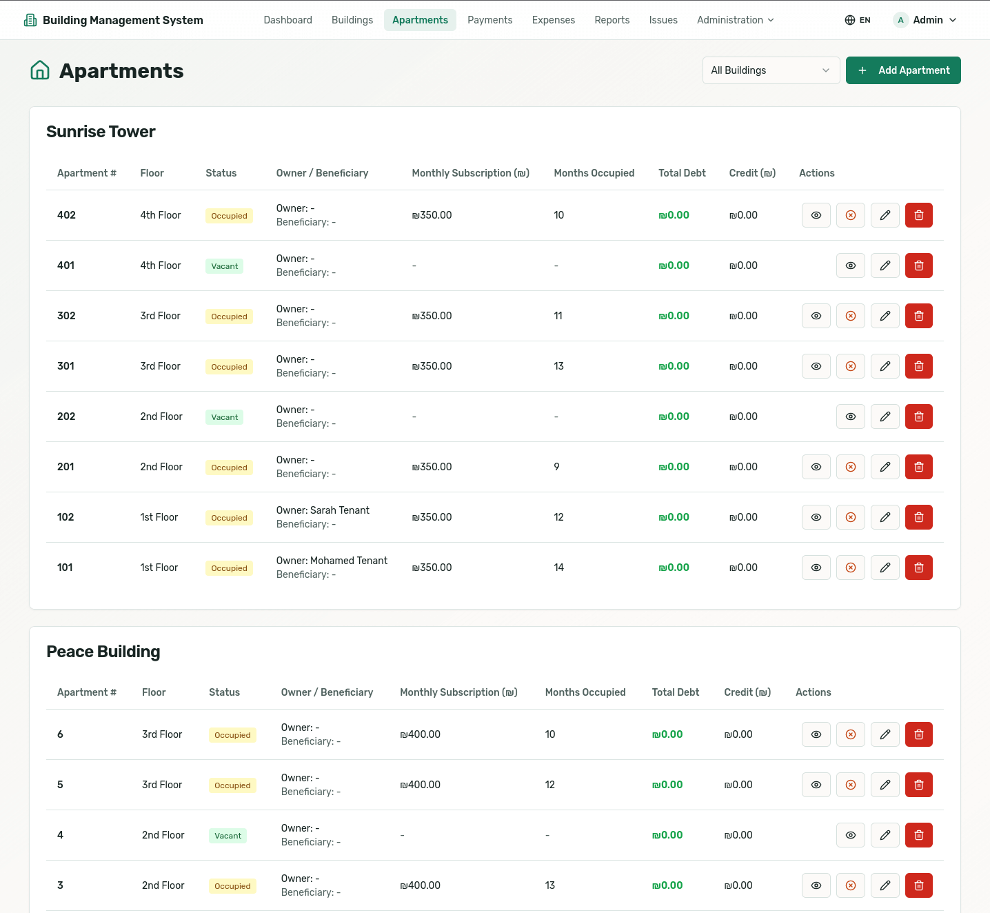 Managing residential or commercial properties doesn’t need to be messy or manual. This building management platform centralizes everything managers and residents need into one secure, easy-to-use system. It gives full visibility into your property portfolio, allowing you to register buildings and apartments, track occupancy, manage subscriptions, and monitor each unit’s financial status in real time.