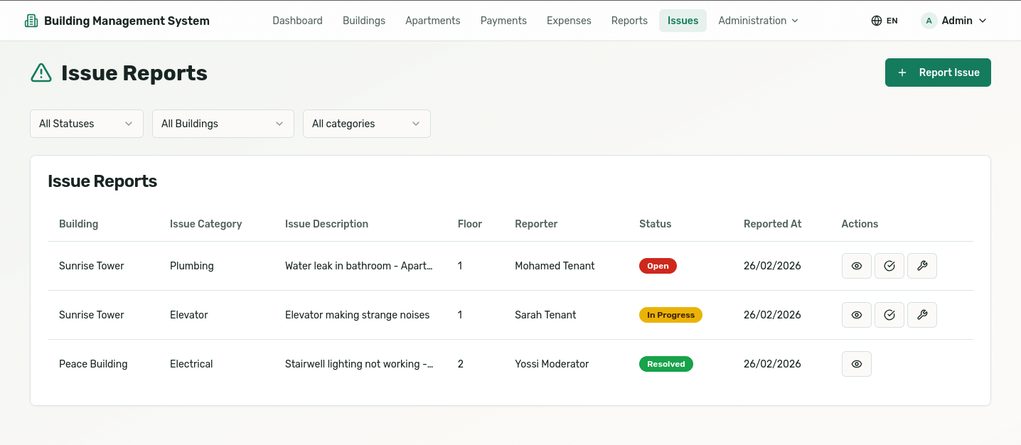 Tenants view their apartment status, balances, and payment history. Submit issue reports and track maintenance requests. All from their phone.