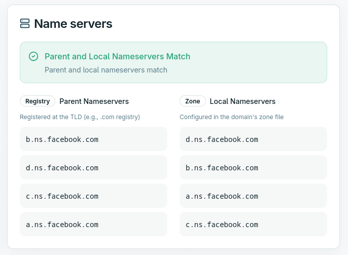 Compare parent (TLD) vs local nameservers to detect DNS proxying or migration issues